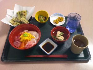 海鮮丼(マグロ、はまち、サーモン、甘エビ)、海老しんじょうのお吸い物、竹輪と舞茸の天婦羅、ホウレン草の白和え、鳴門金時の大学芋 です。